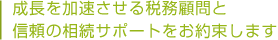 税金というのは、会社が利益に応じて支払うといった単調なものではなく、個人の所得税や相対的な節税なども考慮して総合的に対策をとることで会社の成長を飛躍的に伸ばすことが出来ます。税務会計は企業活動とは切り離して考えることが出来ない重要なものです。御社の発展につながる税務顧問で必ずや経営者の方の夢のお役に立てることと思います。
